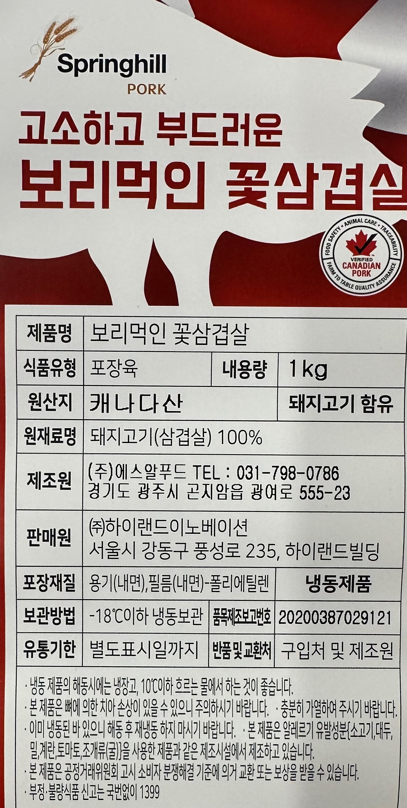 <보리 먹고 자란 꽃삼겹살(냉동)>